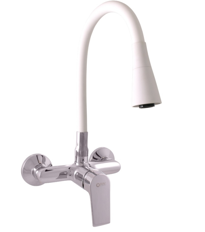 Vodovodní baterie dřezová nástěnná s flexibilním otočným ramínkem se sprchou.