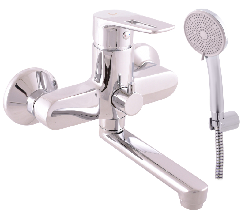 Vodovodní baterie vanová nástěnná s plochým otočným ramínkem, sprchou a pevným držákem.