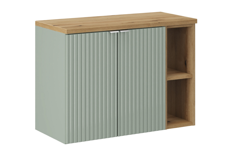 Funkční a stylová skříňka pod umyvadlo v kombinaci s elegantní pracovní deskou a praktickou skříňkou pod desku vytváří harmonický celek, který jistě ohromí vaše hosty. Svislé frézované drážky na čelních plochách dodávají moderní charakter, zatímco lesklé chromované úchytky zdůrazňují vysoce kvalitní povrchovou úpravu.