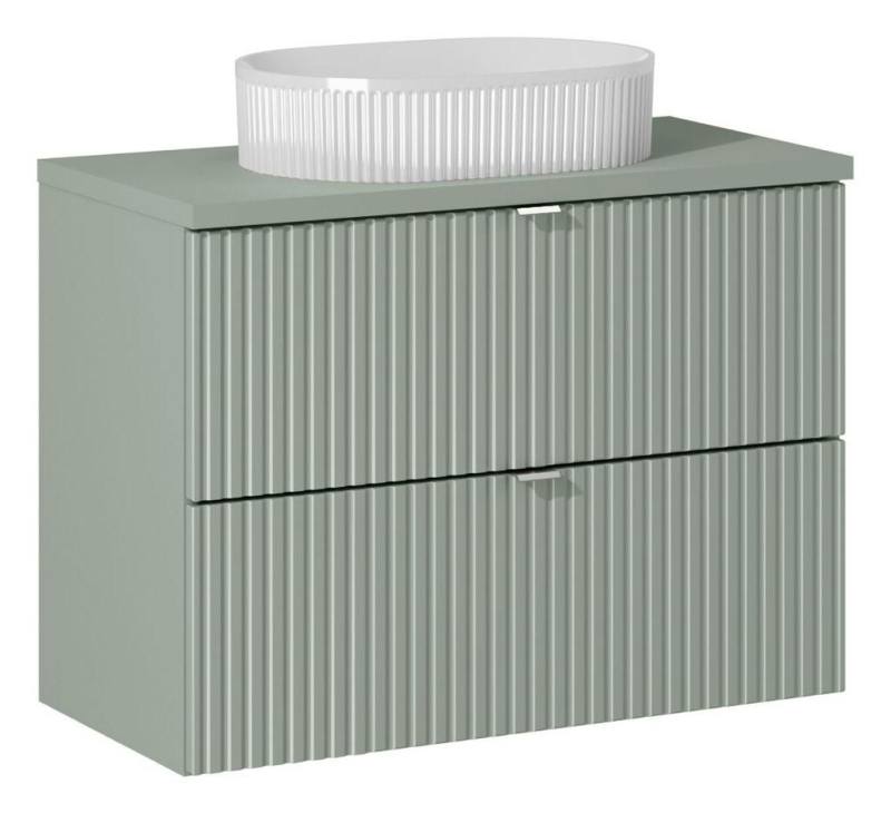 Čela nábytku mají frézované svislé drážky, které jim dodávají moderní vzhled. Stříbrné úchytky jsou decentní a plynule ladí se zbytkem nábytku. Sada se skládá ze tří prvků: umyvadlové skříňky ADEL OAK 82-80-B-2S, desky LINE REED GREEN B 89-80 a umyvadla na desku BEYOND 5 WHITE (E-6564).
