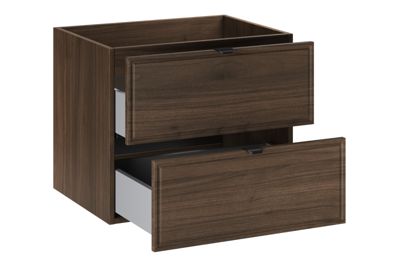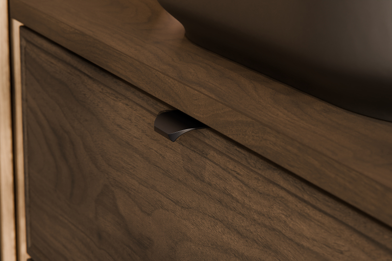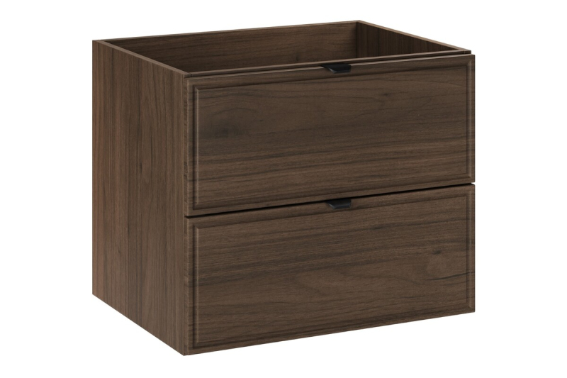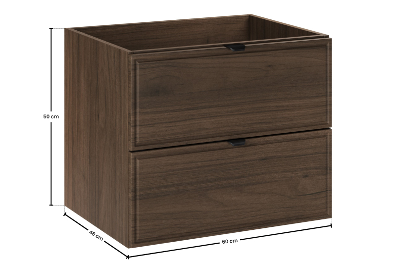 Umyvadlová skříňka o šířce 60 cm z kolekce Terra Villa kombinuje klasickou eleganci s moderním stylem. Výrazné čela s decentním, frézovaným rámem zaujmou svým nadčasovým tvarem. Dekor ořech Villa zaujme svými sytými barvami a přírodní dřevěnou kresbou, která do interiéru vnáší teplo, klid a vytříbený charakter, zatímco štíhlé černé kovové úchytky decentně doplňují barevné schéma kolekce a zdůrazňují její soudržnost a moderní charakter.