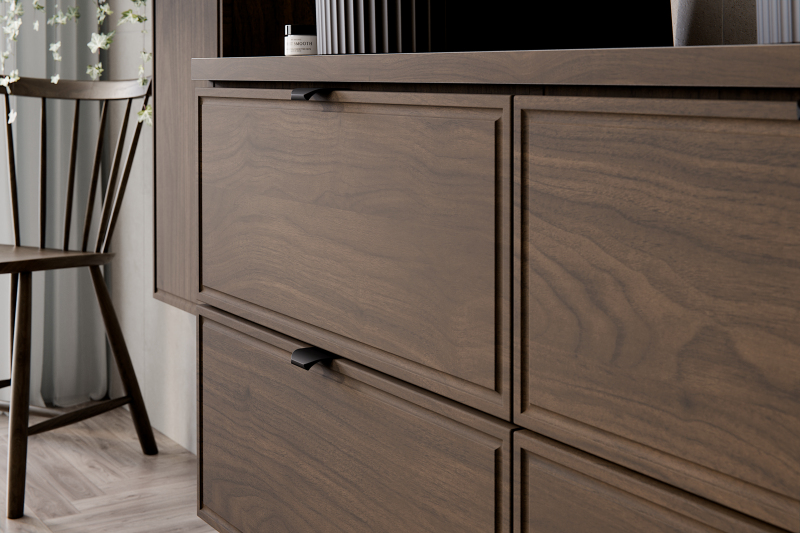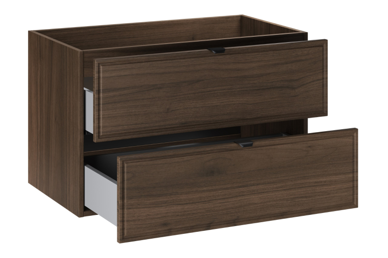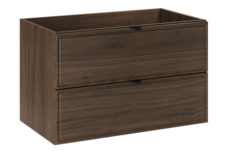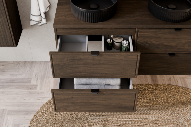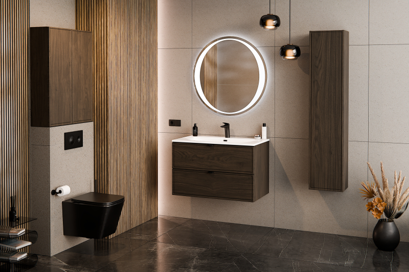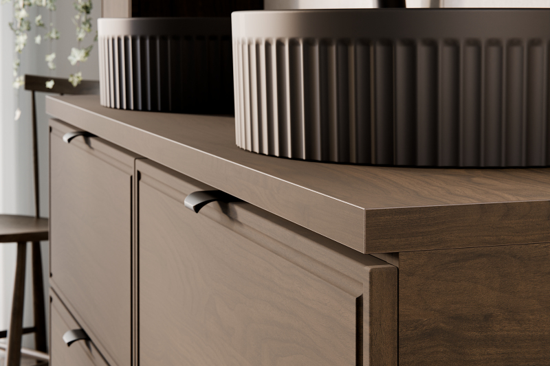 Umyvadlová skříňka o šířce 80 cm z kolekce Terra Villa kombinuje klasickou eleganci s moderním stylem. Výrazné čela s decentním, frézovaným rámem zaujmou svým nadčasovým tvarem. Dekor ořech Villa zaujme svými sytými barvami a přírodní dřevěnou kresbou, která do interiéru vnáší teplo, klid a vytříbený charakter, zatímco štíhlé černé kovové úchytky decentně doplňují barevné schéma kolekce a zdůrazňují její soudržnost a moderní charakter.