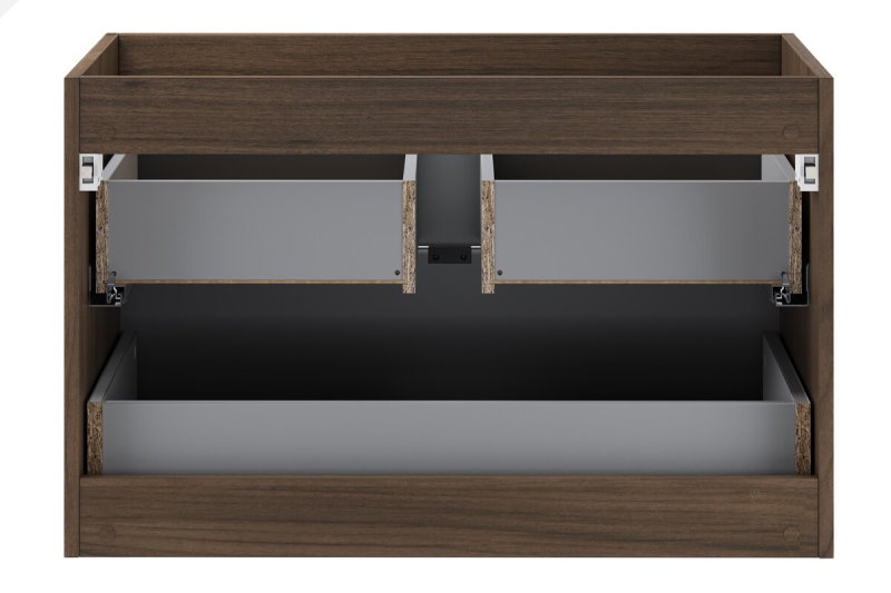 Dvě prostorné zásuvky poskytují pohodlné uložení koupelnových doplňků a pomáhají udržovat každodenní pořádek. Systém tlumeného zavírání zajišťuje mimořádně pohodlné používání a zdůrazňuje důraz na detail při každodenním používání. Spodní skříňky o hloubce 46 cm a výšce 50 cm kombinují funkčnost s lehkým a vzdušným pocitem. Jejich promyšlené proporce dodávají interiéru prostornost, zatímco samotný nábytek zůstává prostorný a praktický. Kolekce je vyrobena z MDF a laminované desky a potěší svou odolností a estetikou po mnoho let.