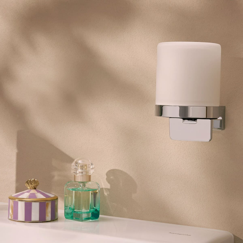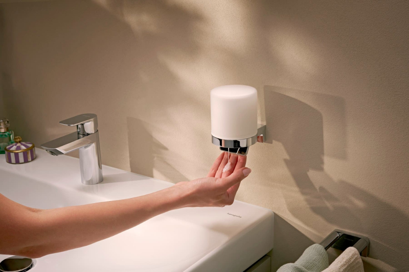 Dávkovač mýdla v chromovém provedení. Šířka tohoto koupelnového doplňku od značky Hansgrohe je 8,1 cm a je vyroben z materiálu kov, sklo. Montáž vrtáním.