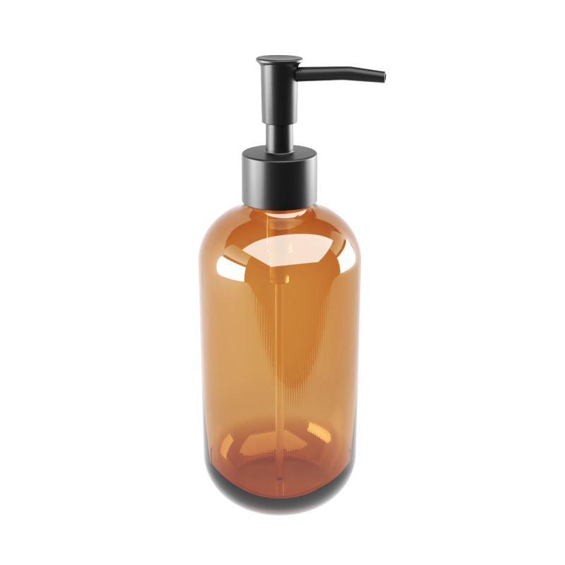 Dávkovač na tekuté mýdlo z průsvitného hnědého skla v lesklém provedení. Pumpička plastová, černá matná. Objem 250 ml.