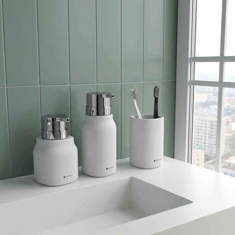 Dávkovač mýdla lze doplnit také o další výrobky stejné designové řady, jako pohárek na zubní kartáčky.