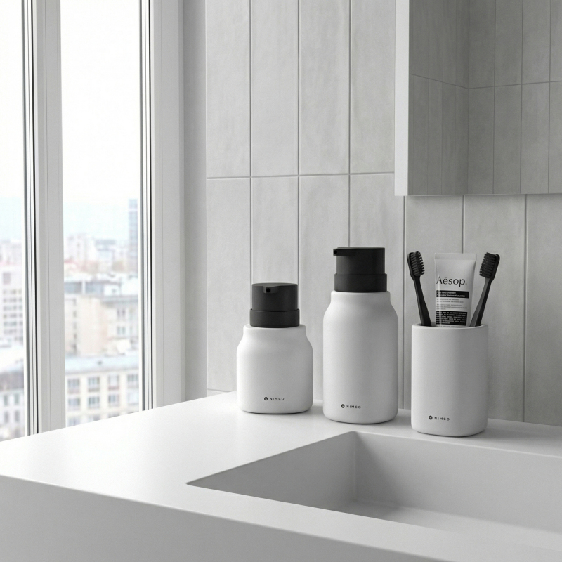 Dávkovač mýdla lze doplnit také o další výrobky stejné designové řady, jako pohárek na zubní kartáčky.