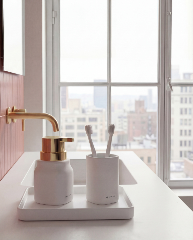 Dávkovač mýdla lze doplnit také o další výrobky stejné designové řady, jako pohárek na zubní kartáčky.