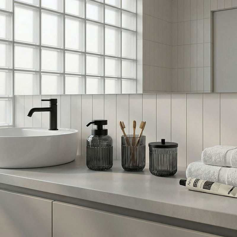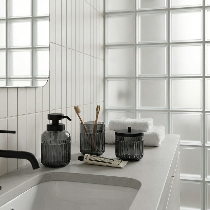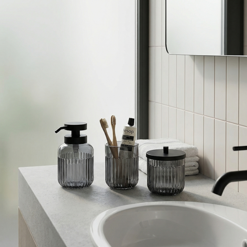 Nová elegantní skleněná série Timo přináší do vaší koupelny moderní a harmonický vzhled. Už nemusíte mít po vaně a umyvadle roztroušené různé plastové barevné lahvičky. Se sérií TIMO bude vaše koupelna neustále čistá a uspořádaná. Sklo dodává koupelně eleganci a nadčasovost. Doporučujeme dokoupit podnos na skleněné nádobky AB 70. S touto kolekcí proměníte svou koupelnu v prostor, který je stylový, praktický a vždy dokonale uklizený.
