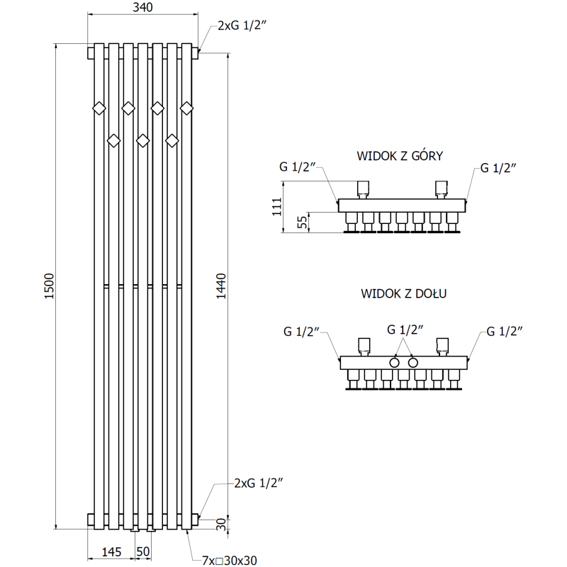 Technické údaje: Výška: 1500 mm Šířka: 340 mm Hloubka: 102 mm Rozteč připojení: - 144 cm (bočně) nebo 5 cm (uprostřed) Barva: Antracitová RAL 7016 Materiál: Ocel Hmotnost: 13,16 kg Reakce na oheň: A1 Provozní teplota: max. 95 °C Maximální provozní tlak: 0,6 MPa Topný výkon: - 75/65/20 °C - 630 W Připojení: - 2xG ½″ uprostřed - 4xG ½″ shora a zdola na pravé nebo levé straně Počet háčků na ručníky: 7 Vysoce kvalitní, odolný, korozivzdorný nátěr Sada obsahuje: závěsy, montážní sadu, záslepky a odvzdušňovací otvor