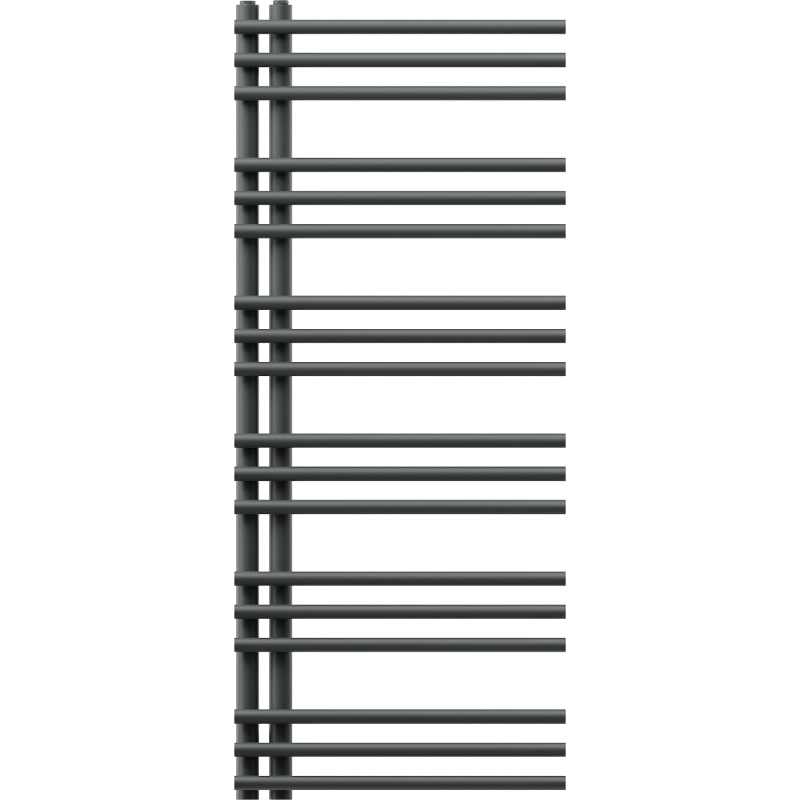 Technické údaje: Výška: 1200 mm Šířka: 500 mm Hloubka: 66 mm Rozteč připojení: 5 cm Barva: Antracitová RAL 7016 Materiál: Ocel Hmotnost: 8,47 kg Reakce na oheň: A1 Provozní teplota: max. 95 °C Maximální provozní tlak: 0,6 MPa Topný výkon: - 75/65/20 °C - 456 W Připojení: - 4xG ½″ uprostřed Možnost instalace topného tělesa Vysoce kvalitní, odolný nátěr odolný proti korozi Sada obsahuje: závěsy, montážní sadu, záslepky a odvzdušňovací otvor