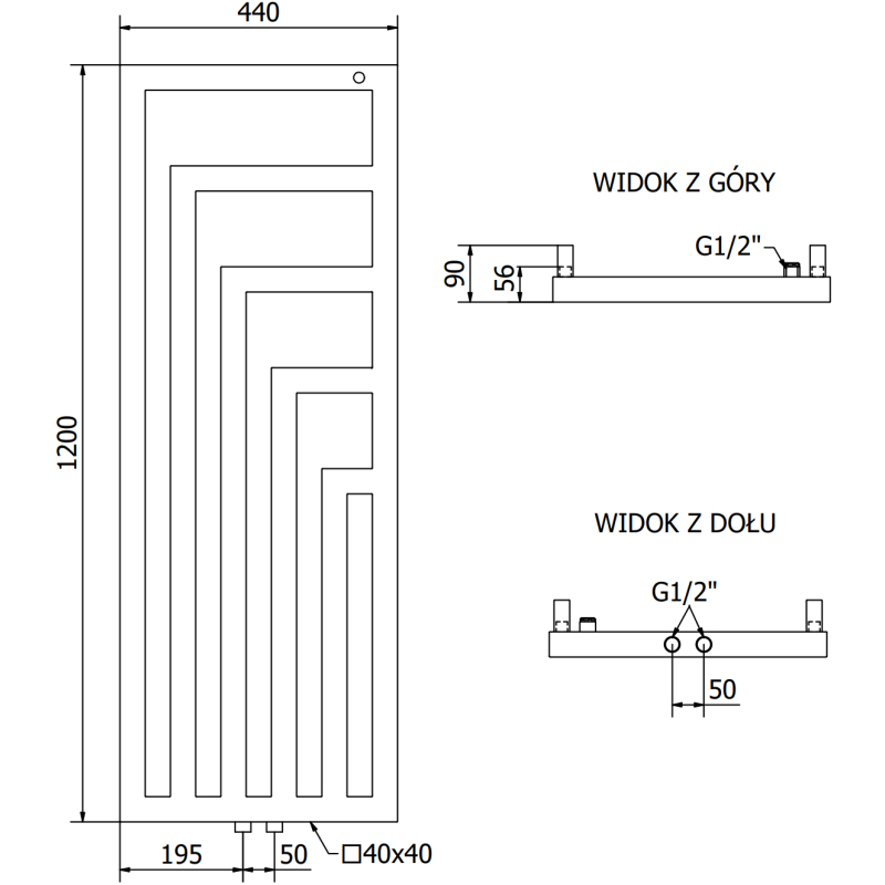 Technické údaje: Výška: 1216 mm Šířka: 440 mm Hloubka: 56 mm Rozteč připojení: 5 cm Barva: Černá RAL 9005 Materiál: Ocel Hmotnost: 12 kg Reakce na oheň: A1 Provozní teplota: max. 95 °C Maximální provozní tlak: 0,6 MPa Topný výkon: - 75/65/20 °C - 542 W Připojení: - 2xG ½″ střední Vysoce kvalitní, odolný nátěr odolný proti korozi Sada obsahuje: závěsy, montážní sadu, záslepky a odvzdušňovací otvor