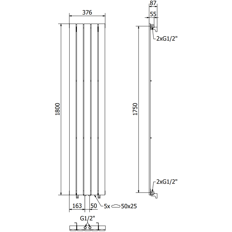 Technické údaje: Výška: 1800 mm Šířka: 376 mm Hloubka: 55 mm Rozteč připojení: - 175 cm (bočně) nebo 5 cm (uprostřed) Barva: Černá RAL 9005 Materiál: Ocel Hmotnost: 16,38 kg Reakce na oheň: A1 Provozní teplota: max. 95 °C Maximální provozní tlak: 0,3 MPa Topný výkon: - 75/65/20 °C - 740 W Připojení: - 2xG ½″ uprostřed - 4xG ½″ shora a zdola na pravé nebo levé straně Vysoce kvalitní, odolný antikorozní nátěr Sada obsahuje: závěsy, montážní sadu, záslepky a odvzdušňovací otvor