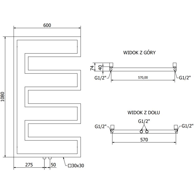 Technické údaje: Výška: 1080 mm Šířka: 600 mm Hloubka: 40 mm Rozteč připojení: - 57 cm (bočně) nebo 5 cm (uprostřed) Barva: Černá RAL 9005 Materiál: Ocel Hmotnost: 8,1 kg Reakce na oheň: A1 Provozní teplota: max. 95 °C Maximální provozní tlak: 0,6 MPa Topný výkon: - 75/65/20 °C - 358 W Připojení: - 2xG ½″ uprostřed - 4xG ½″ shora a zdola na pravé nebo levé straně Vysoce kvalitní, odolný nátěr odolný proti korozi Sada obsahuje: závěsy, montážní sadu, záslepky a odvzdušňovací otvor