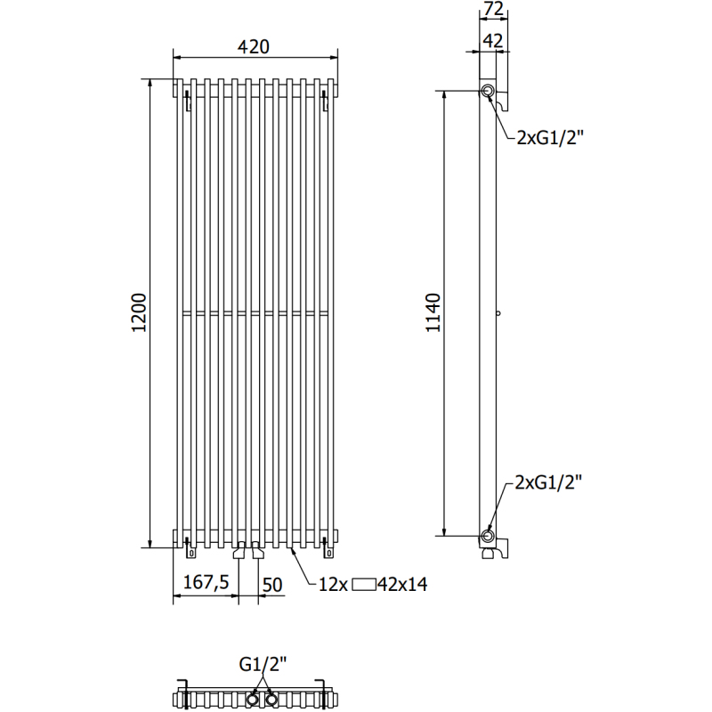 Technické údaje: Výška: 1200 mm Šířka: 420 mm Hloubka: 42 mm Rozteč připojení: - 114 cm (bočně) nebo 5 cm (uprostřed) Barva: Černá RAL 9005 Materiál: Ocel Hmotnost: 20,96 kg Reakce na oheň: A1 Provozní teplota: max. 95 °C Maximální provozní tlak: 0,4 MPa Topný výkon: - 75/65/20 °C - 842 W Připojení: - 2xG ½″ uprostřed - 4xG ½″ shora a zdola na pravé nebo levé straně Vysoce kvalitní, odolný nátěr odolný proti korozi Sada obsahuje: závěsy, montážní sadu, záslepky a odvzdušňovací otvor