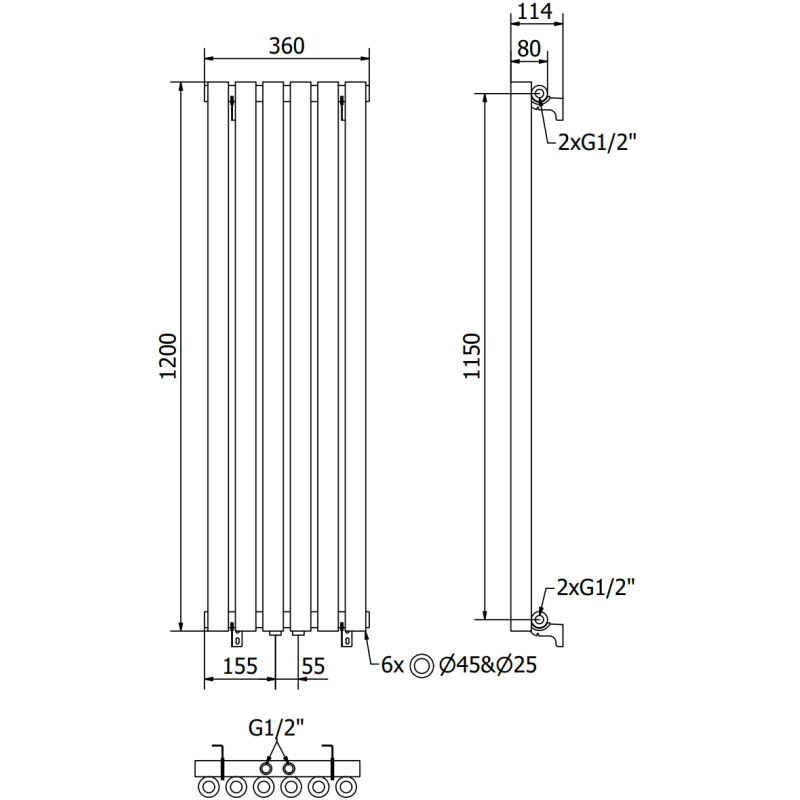 Technické údaje: Výška: 1200 mm Šířka: 360 mm Hloubka: 78 mm Rozteč připojení: - 115 cm (bočně) nebo 5 cm (uprostřed) Barva: Černá RAL 9005 Materiál: Ocel Hmotnost: 14,42 kg Reakce na oheň: A1 Provozní teplota: max. 95 °C Maximální provozní tlak: 0,6 MPa Topný výkon: - 75/65/20 °C - 483 W Připojení: - 2xG ½″ uprostřed - 4xG ½″ shora a zdola na pravé nebo levé straně Vysoce kvalitní, odolný nátěr odolný proti korozi Sada obsahuje: závěsy, montážní sadu, záslepky a odvzdušňovací otvor