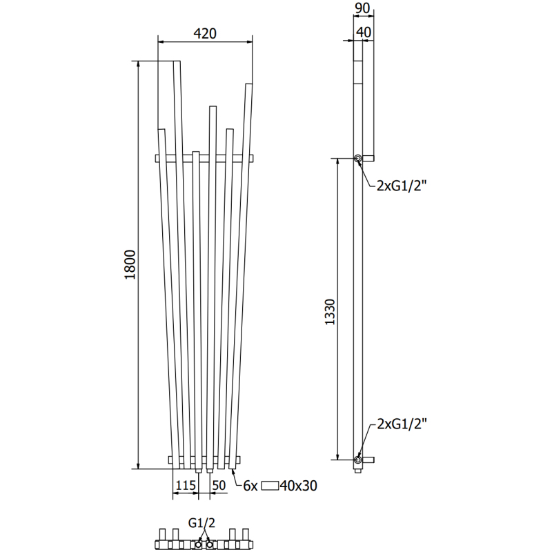 Technické údaje: Výška: 1800 mm Šířka: 420 mm Hloubka: 50 mm Rozteč připojení: - 133 cm (bočně) nebo 5 cm (uprostřed) Barva: Černá RAL 9005 Materiál: Ocel Hmotnost: 14,25 kg Reakce na oheň: A1 Provozní teplota: max. 95 °C Maximální provozní tlak: 0,6 MPa Topný výkon: - 75/65/20 °C - 655 W Připojení: - 2xG ½″ uprostřed - 4xG ½″ shora a zdola na pravé nebo levé straně Vysoce kvalitní, odolný nátěr odolný proti korozi Sada obsahuje: závěsy, montážní sadu, záslepky a odvzdušňovací otvor