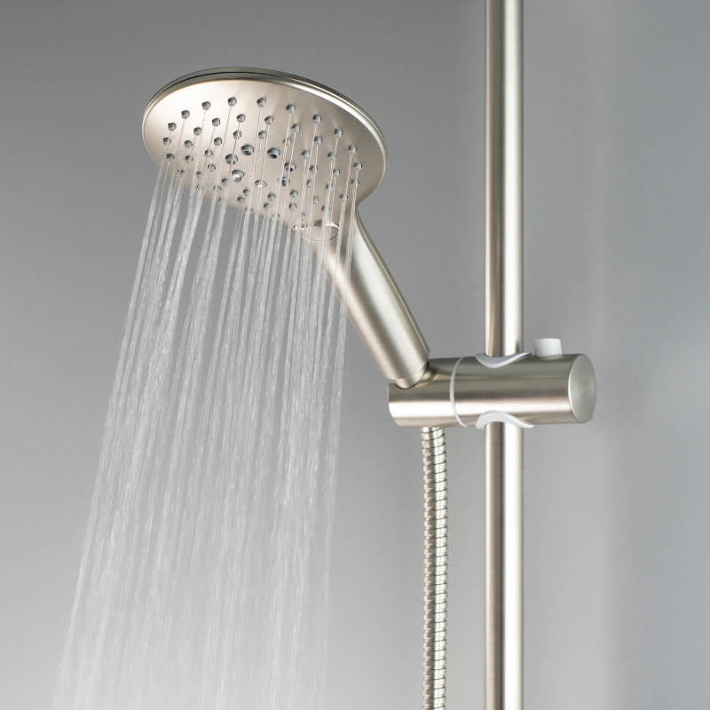 Dešťová sprcha je vyrobena z nerezové oceli. Ruční sprcha a držák jsou vyrobeny z ABS plastu a nabízejí tři režimy proudu: déšť, hydromasáž a smíšený. Celá jednotka je v barvě kartáčované oceli. Sprchová hlavice má průměr 20 cm, zatímco ocelová hadice má délku 150 cm. Tyč má pohyblivý nástěnný držák, který lze instalovat do stávajících otvorů.