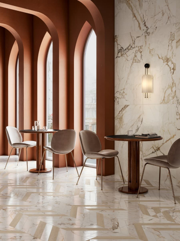Rektifikované. Mrazuvzdorné. Dlažba v barevném provedení arco a v imitaci mramoru o rozměru 60x120 cm a tloušťce 10 mm s leštěným povrchem. Vhodné do interiéru i exteriéru. S velkými a nahodilými odchylkami v odstínu barev, struktury povrchu a kresby.PEI 4 – vysoká odolnost