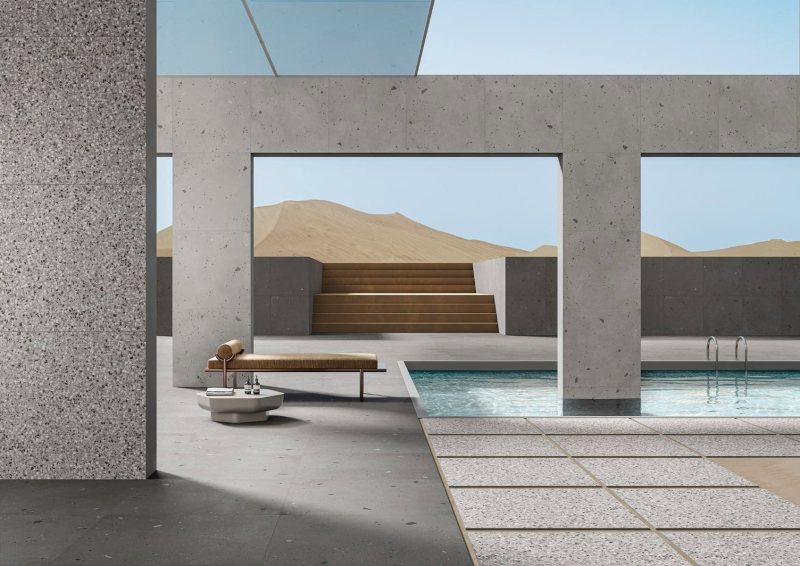 Rektifikované. Mrazuvzdorné. Dlažba v barevném provedení lead a v terrazzo designu o rozměru 89,7x89,7 cm a tloušťce 9 mm s matným povrchem. Vhodné do interiéru i exteriéru. S malými rozdíly v odstínu barev, struktury povrchu a kresby.PEI 4 – vysoká odolnost