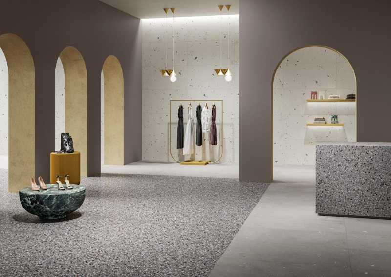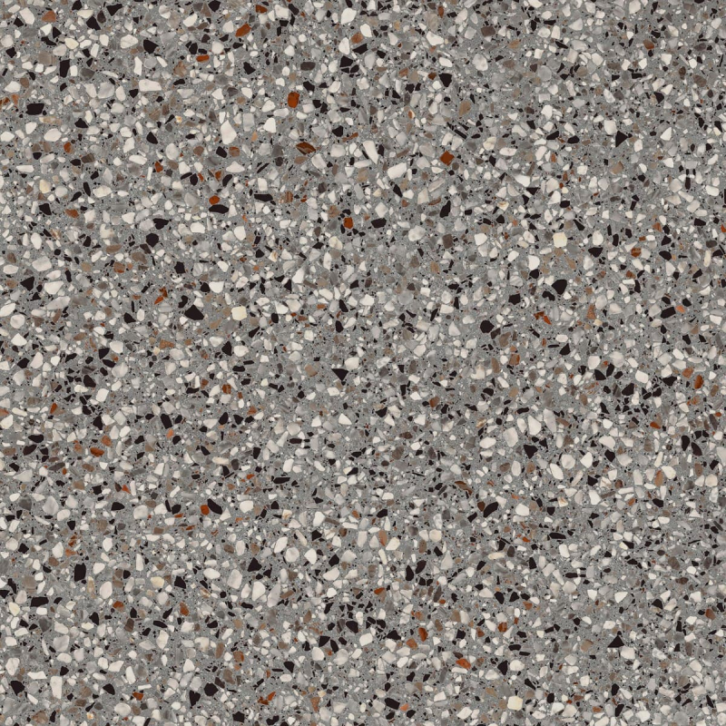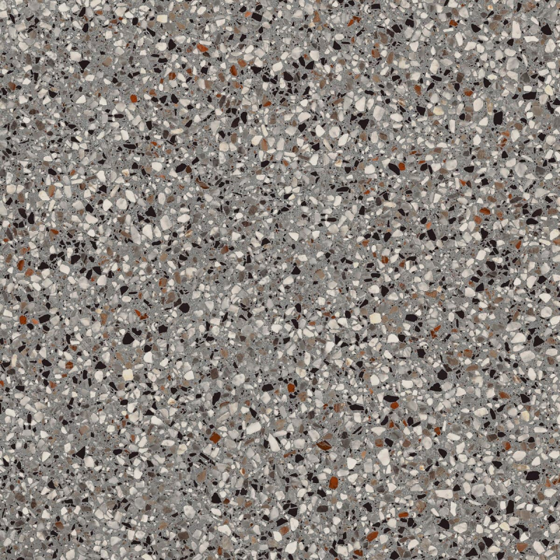 Rektifikované. Mrazuvzdorné. Dlažba v barevném provedení lead a v terrazzo designu o rozměru 89,7x89,7 cm a tloušťce 9 mm s matným povrchem. Vhodné do interiéru i exteriéru. S malými rozdíly v odstínu barev, struktury povrchu a kresby.PEI 4 – vysoká odolnost