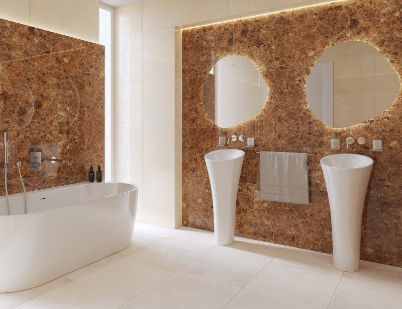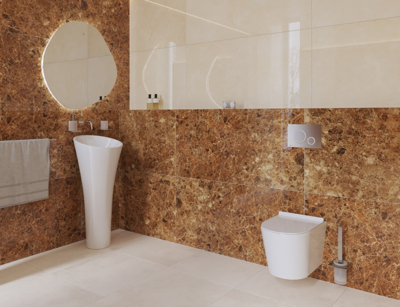 Rektifikované. Mrazuvzdorné. Dlažba v barevném provedení emperador brown a v imitaci mramoru o rozměru 60x120 cm a tloušťce 8,5 mm s leštěným povrchem. Vhodné pouze do interiéru.