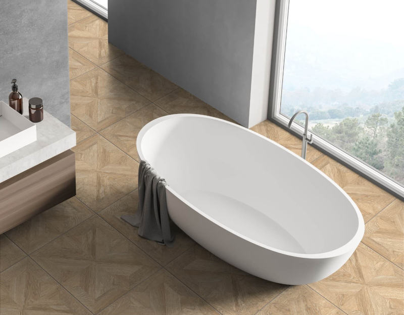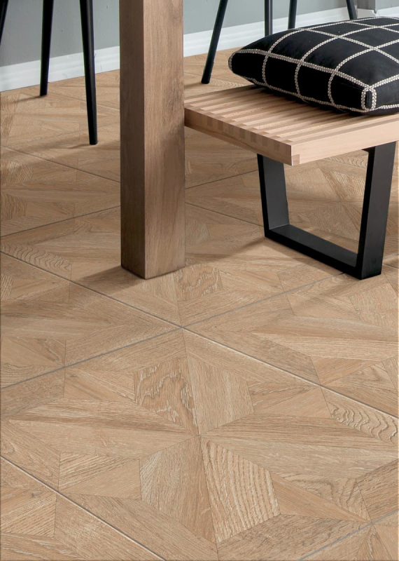 Dlažba v barvě beige a v imitaci dřeva o rozměru 45x45 cm a tloušťce 8 mm s matným povrchem. Vhodné pouze do interiéru. S malými rozdíly v odstínu barev, struktury povrchu a kresby.