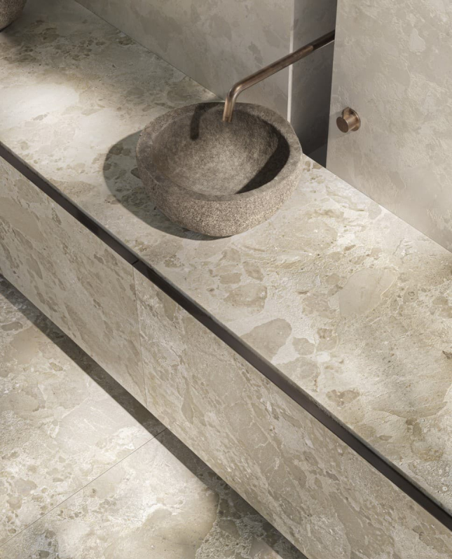 Rektifikované. Mrazuvzdorné. Dlažba v barvě greige a v imitaci kamene o rozměru 59,6x59,6 cm a tloušťce 8,5 mm s matným povrchem. Vhodné do interiéru i exteriéru.PEI 5 – nejvyšší odolnost