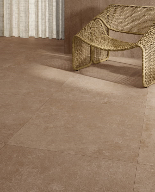 Rektifikované. Mrazuvzdorné. Dlažba v barevném provedení earth a v betonovém designu o rozměru 60x60 cm a tloušťce 8,5 mm s matným povrchem. Vhodné do interiéru i exteriéru. S malými rozdíly v odstínu barev, struktury povrchu a kresby. Vysoce odolné proti opotřebení. Vhodné do hal hotelů, obchodů a garáže.