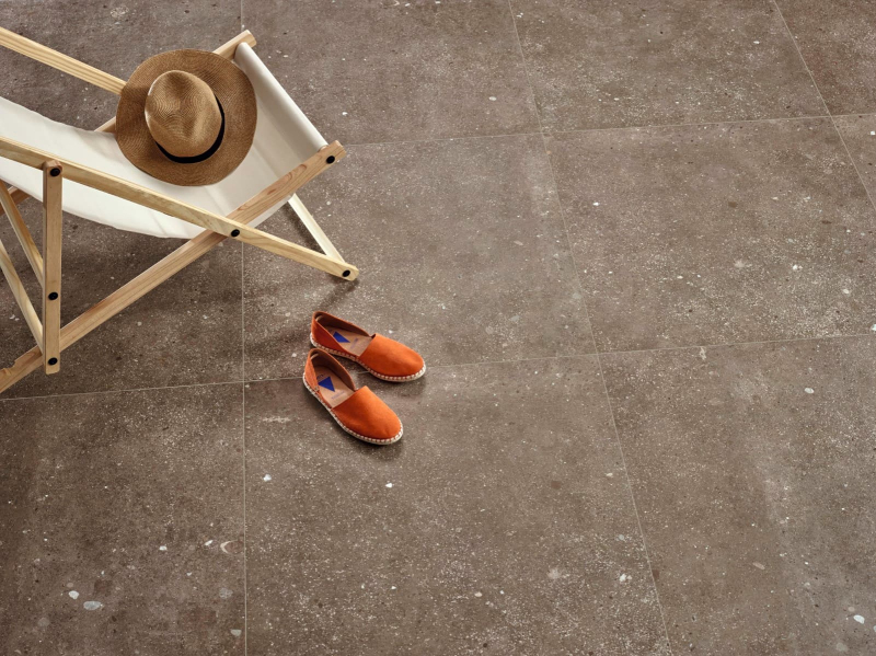 Rektifikované. Mrazuvzdorné. Dlažba v barvě brown a v imitaci betonu o rozměru 120x120 cm a tloušťce 10,5 mm s matným povrchem. Vhodné do interiéru i exteriéru. S velkými rozdíly v odstínu barev, struktury povrchu a kresby. Vysoce odolné proti opotřebení. Vhodné do hal hotelů, obchodů a garáže.
