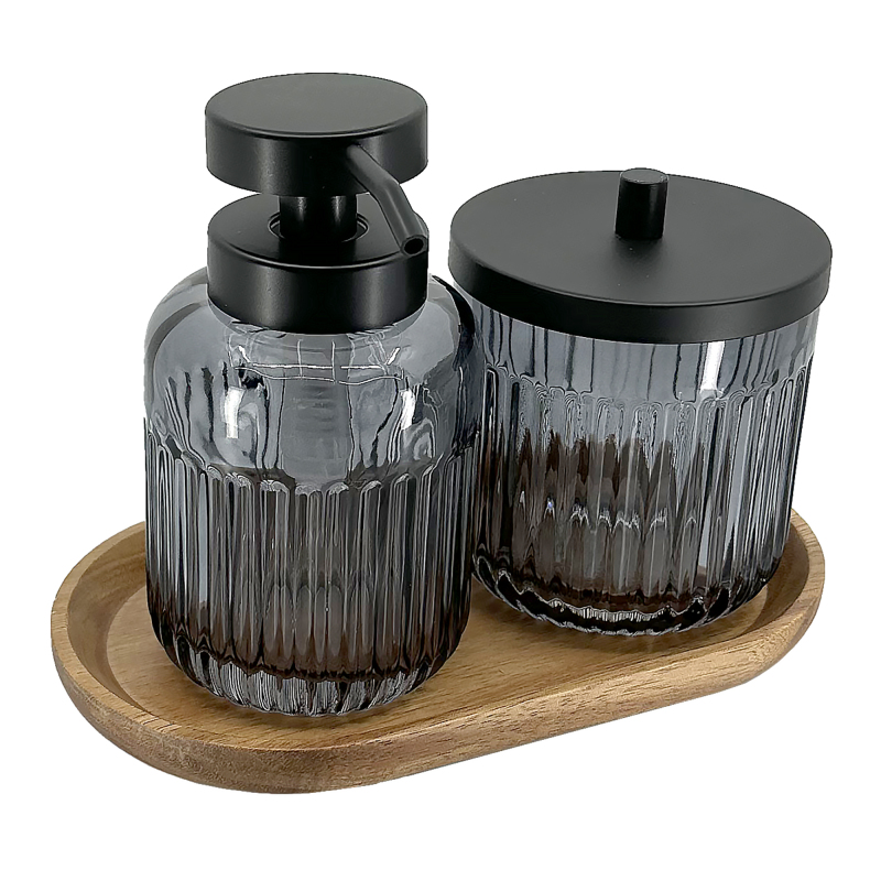 Nová elegantní skleněná série Timo přináší do vaší koupelny moderní a harmonický vzhled. Už nemusíte mít po vaně a umyvadle roztroušené různé plastové barevné lahvičky. Se sérií TIMO bude vaše koupelna neustále čistá a uspořádaná. Sklo dodává koupelně eleganci a nadčasovost. Doporučujeme dokoupit podnos na skleněné nádobky AB 70. S touto kolekcí proměníte svou koupelnu v prostor, který je stylový, praktický a vždy dokonale uklizený.