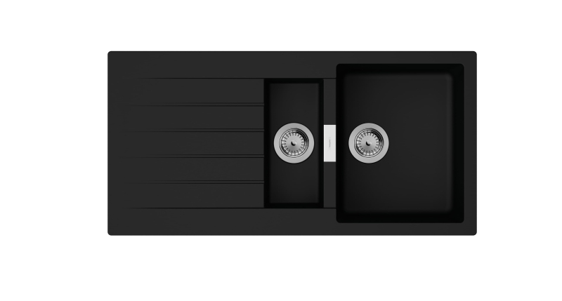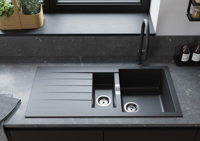 Jednodřez s vaničkou s odkapávačem v barveném provedení grafitová černá s montáží na pracovní desku o rozměru 100x50 cm a hloubkou 19,5 cm.