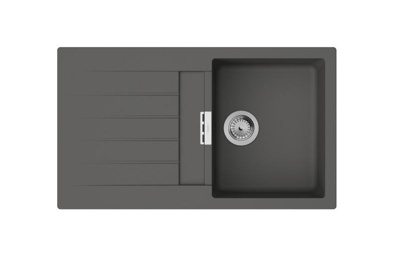 Jednodřez s odkapávačem v barveném provedení kamenná šedá s montáží na pracovní desku o rozměru 86x50 cm a hloubkou 19,5 cm.