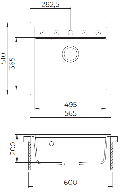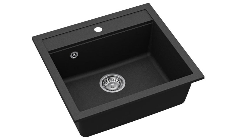 Granitový jednodřez černý s montáží na pracovní desku o rozměru 56,5x51 cm a hloubkou 20 cm. Vhodný pro montáž do skříňky o šířce 60 cm.