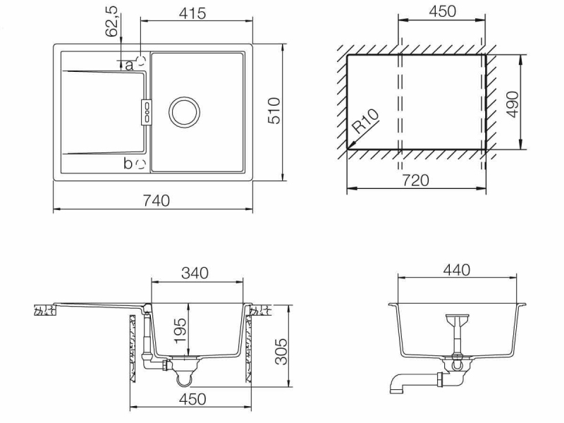 Granitový jednodřez s odkapávačem v barvě Magma s montáží na pracovní desku o rozměru 76,5x51 cm a hloubkou 19,5 cm. Vhodný pro montáž do skříňky o šířce 50 cm.