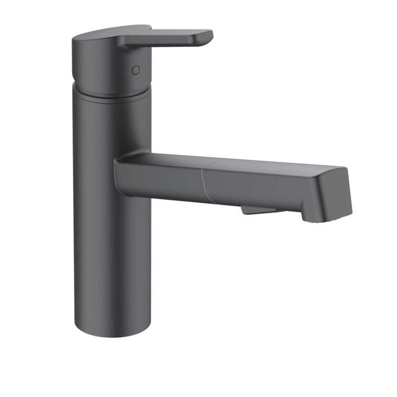 Páková stojánková dřezová baterie s vytahovací sprškou, 2 proudy v černém matném provedení. Průtok je 9 litrů/minutu. Výška baterie je 23,5 cm. Ramínko je ve výšce 14,5 cm. S matným povrchem.