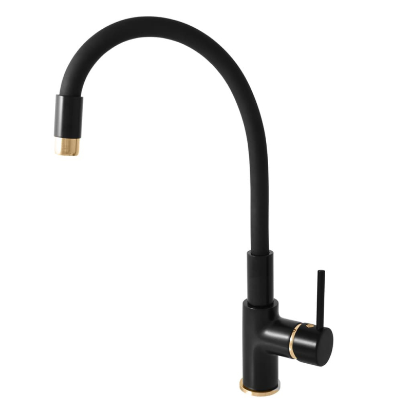 Páková stojánková dřezová baterie se silikonovým ramínkem. V barevném provedení černá/zlato. Výška baterie je 36 cm. S matným povrchem.
