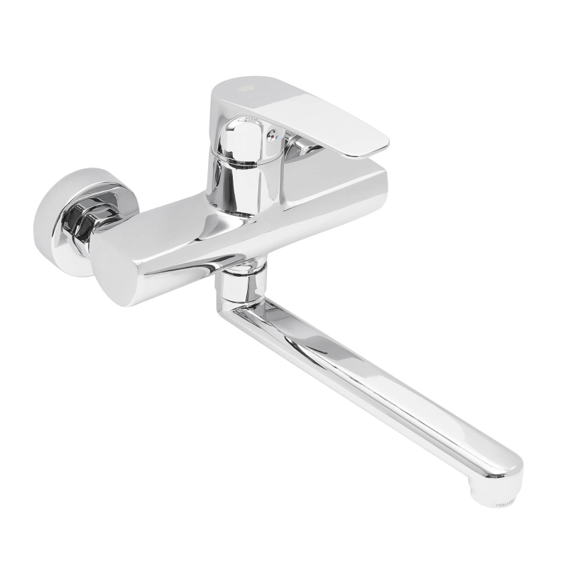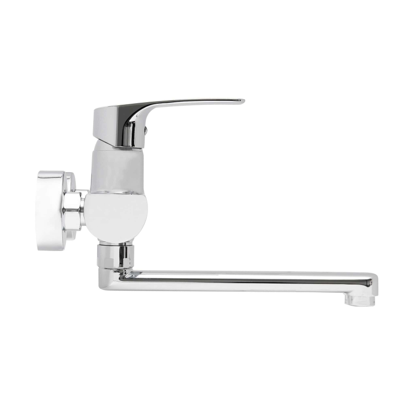 Páková nástěnná dřezová baterie s otočným ramínkem. V chromovém provedení. Rozteč baterie 150 mm.