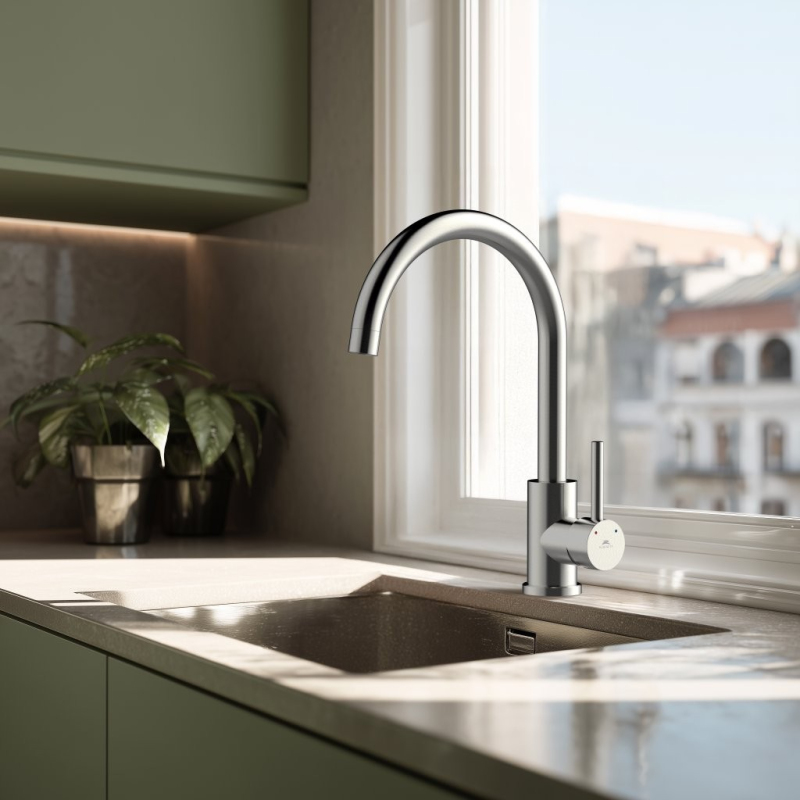 Dřezová stojánková vodovodní baterie SINOX-33 Nerez vyniká vysoce kvalitním zpracováním a spolehlivou funkčností všech součástí a materiálů.