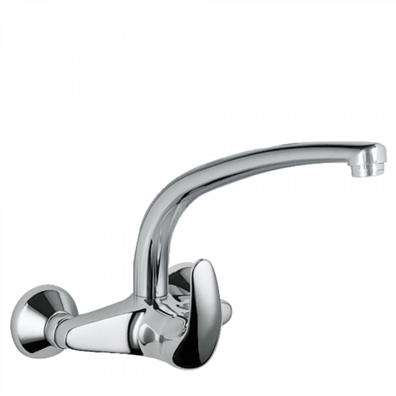Páková nástěnná dřezová baterie s otočným ramínkem. V chromovém provedení. Rozteč baterie 150 mm.