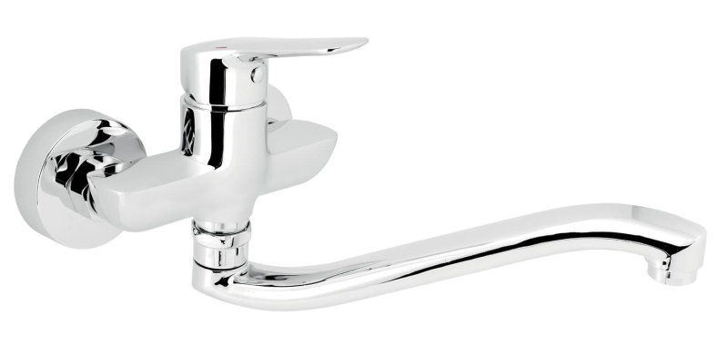 Páková nástěnná dřezová - umyvadlová baterie s otočným ramínkem v chromovém provedení. Rozteč baterie 100 mm. V barevném provedení lesk