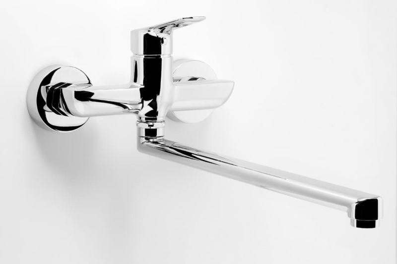 Páková nástěnná dřezová - umyvadlová baterie s otočným ramínkem v chromovém provedení. Rozteč baterie 150 mm. V barevném provedení lesk.