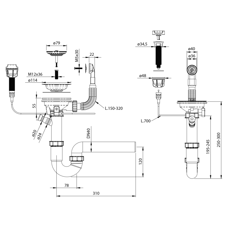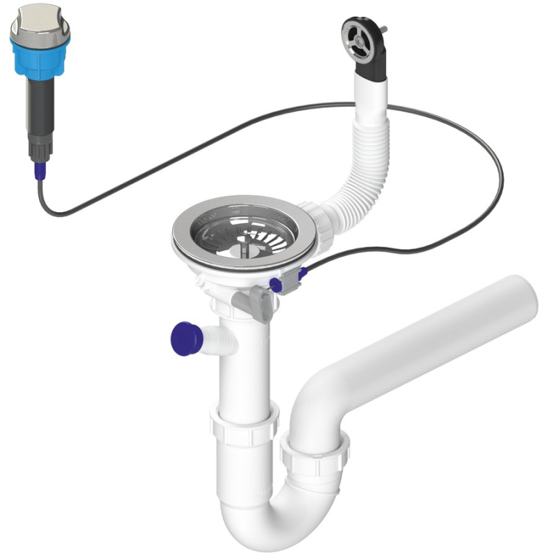 Dřezový sifon s přepadem, ovládáním a odbočkou, 6/4", včetně pilety, DN40, bílá