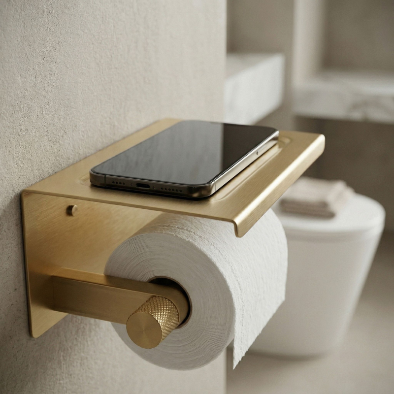 Dbejte na každý detail a maximální funkčnost své koupelny s držákem na toaletní papír s poličkou Ori v barvě kartáčovaného zlata. Tento elegantní a mimořádně praktický doplněk dokonale zapadá do nejnovějších trendů a kombinuje minimalistickou formu se šperkovým zakončením a každodenním pohodlím.Povrchová úprava kartáčované zlato – teplý, matný odstín zlata dodává interiéru elegantní charakter a kartáčovaný povrch usnadňuje údržbu tím, že maskuje drobné stopy používání.Praktická polička – integrovaný plochý prostor nad držákem je ideálním místem pro odložení telefonu, umístění vonných tyčinek, osvěžovače nebo vlhčených ubrousků. Profilovaná hrana účinně chrání předměty před sklouznutím na podlahu.Ozdobné vroubkování – konec tyče byl obohacen o precizní, vroubkovanou strukturu. Tento decentní, rýhovaný detail představuje jedinečnou ozdobu, která přitahuje pohled a zdůrazňuje vysokou kvalitu zpracování produktu.Robustní kovová konstrukce – vyrobení z vysoce kvalitního kovu zaručuje plnou stabilitu, odolnost a odolnost proti vlhkosti v koupelně.Pevná montáž na stěnu – držák se montuje na vruty, což zajišťuje maximální stabilitu a bezpečnost při každodenním používání, i když je polička zatížená.Kompletní kolekce – v naší nabídce najdete i další koupelnové doplňky ze série Ori, což umožňuje vytvořit ucelené a harmonické uspořádání celého interiéru.Výběrem držáku na papír s poličkou Ori kartáčované zlato volíte ideální spojení moderního designu s neobyčejně užitečnou funkčností.