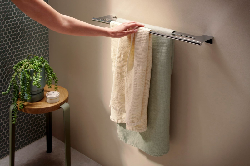 Držák ručníků v chromovém provedení. Šířka tohoto koupelnového doplňku od značky Hansgrohe je 66,1 cm a je vyroben z materiálu kov. Montáž vrtáním.