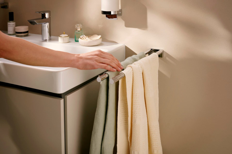 Držák ručníků v chromovém provedení. Šířka tohoto koupelnového doplňku od značky Hansgrohe je 6,7 cm a je vyroben z materiálu kov. Montáž vrtáním.