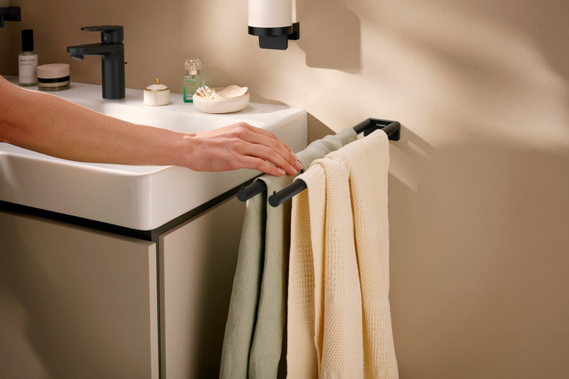 Držák ručníků v barevném provedení matná černá. Šířka tohoto koupelnového doplňku od značky Hansgrohe je 6,7 cm a je vyroben z materiálu kov. Montáž vrtáním.