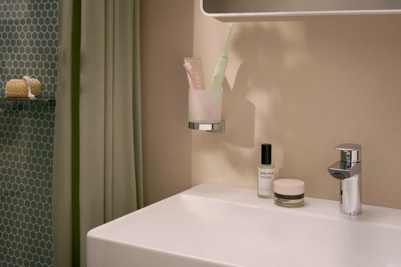 Držák skleniček včetně skleničky v chromovém provedení. Šířka tohoto koupelnového doplňku od značky Hansgrohe je 8,4 cm a je vyroben z materiálu kov, sklo. Montáž vrtáním.