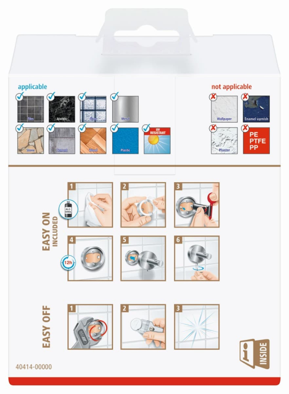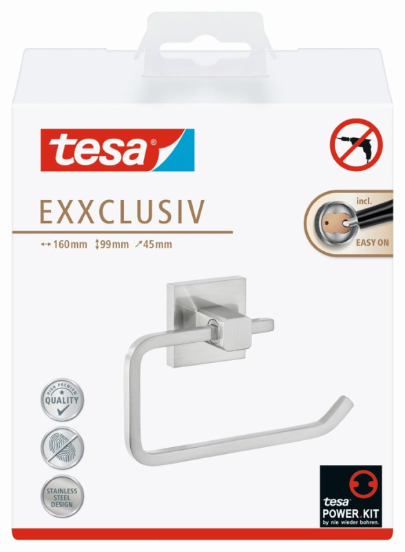 Připevnění samolepicího držáku toaletního papíru tesa® Exxclusiv na stěnu je snadné. Elegantní, hranatý design je vynikající a přitažlivý.