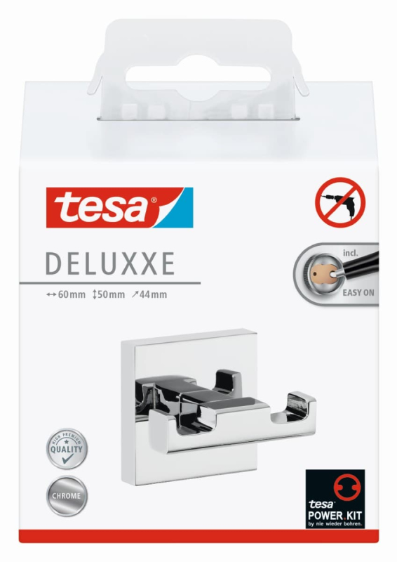 Elegantní samolepicí dvojitý háček tesa® Deluxxe je ozdobou každé koupelny. Také se s ním snadno pracuje.